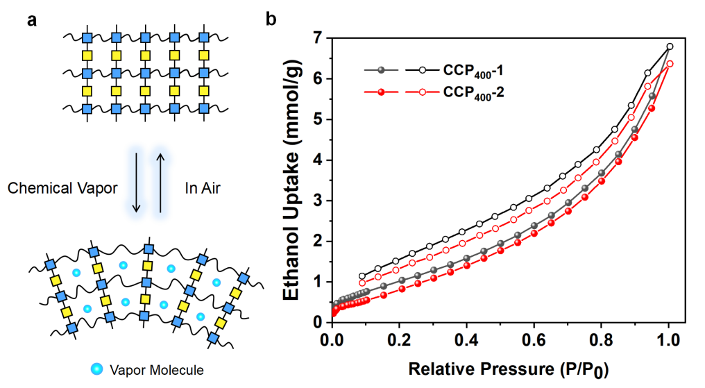 图4. a)CCPs膜的蒸气驱动机制。b)CCP400-1和CCP400-2的乙醇蒸气吸脱附等温曲线。
