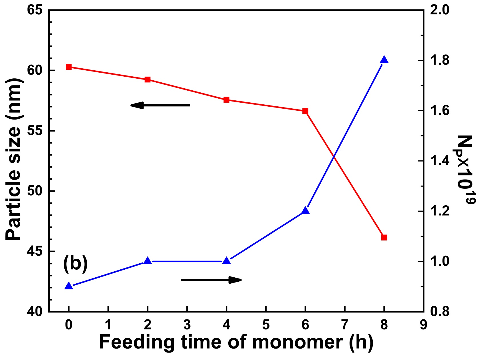 图3. 单体进料时间对NBR胶乳粒径和粒子数的影响