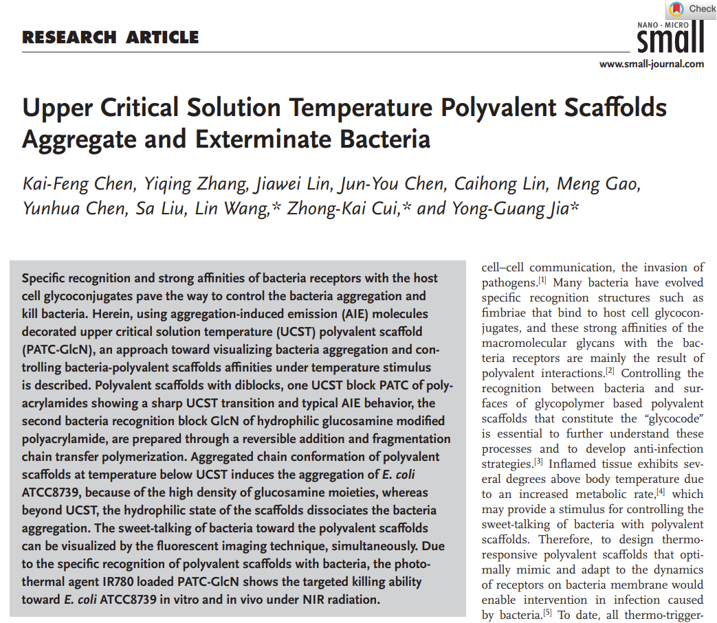近期,华南理工大学贾永光、王琳与南方医科大学崔忠凯合作,在前期工作基础上(Chem. Eng. J. 2022, 134354;Sci. China-Chem.2021, 403;Biomacromolecules2017, 2663),制备了一种AIE分子修饰的最高临界溶液温度(UCST)聚合物支架(PATC-GlcN),该聚合物支架可以作为一种人工细胞模拟物通过温度调控细菌聚集/解离,同时可视化整个细菌聚集/解离过程。这种人工细胞模拟物可以被细菌识别,细菌通常会与聚合物支架上的糖基化残基结合。该UCST聚合物支架PATC-GlcN是双嵌段共聚物,聚丙烯酰胺的第一个嵌段为UCST嵌段显示出典型的UCST转变和AIE行为,亲水性葡糖胺改性聚丙烯酰胺为第二个嵌段具有细菌靶向功能,该聚合物可通过使用可逆加成和断裂链转移(RAFT)聚合(图1)。PATC-GlcN能够组装成胶束状结构,含糖嵌段分布在壳上,疏水核心由AIE-UCST嵌段形成。通过改变温度,可以对特定细菌实现可视化下的聚集/解离过程的可逆调控。此外,该团队还研究了该多价支架负载光热剂(IR780)后,在近红外辐射下体外和体内对大肠杆菌ATCC8739的定向清除,其杀菌效率可以从40%提高到99%以上。近日该工作作为Research Article 在线发布在Small 上(Upper Critical Solution Temperature Polyvalent Scaffolds Aggregate and Exterminate Bacteria, Small, 2022, doi/10.1002/smll.202107374)。华南理工大学贾永光副研究员、王琳研究员与南方医科大学崔忠凯教授为文章通讯作者。