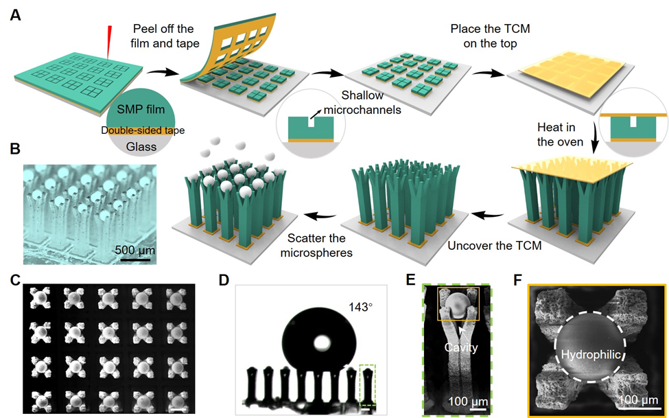 该工作是团队近期关于飞秒激光与形状记忆聚合物相互作用相关研究的最新进展之一。在此之前,团队利用飞秒激光刻蚀热收缩形状记忆聚合物,发现了激光诱导聚合物自生长效应(Adv. Mater. 2018, 30, 1803072.),在此基础上利用不同材料的收缩特性,实现了凹角微柱结构的高效制备,并展示了在低表面能液体操控领域的应用(Nano Lett. 2021, 21, 9301-9309.)。