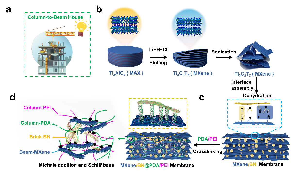 图1 MXene/BN@PDA/PEI膜的制备示意图:(a)具有梁-柱结构的房子,(b) Ti3C2Tx (MXene)纳米片制备,(c) MXene纳米片与BN纳米片组装成2D/2D架构,(d) PDA和PEI通过共价交联反应承担MXene/BN@PDA/PEI复合膜“立柱”部分的作用