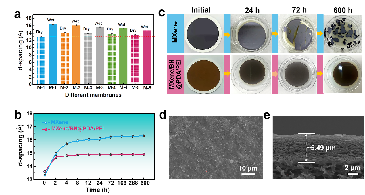 图 2 (a) MXene膜(M-1), MXene/BN膜(M-2)、MXene/BN@PEI膜(M-3)、MXene/BN@PDA膜(M-4)和MXene/BN@PDA/PEI膜(M-5)在干燥与润湿状态下的层间距,(b) MXene膜与MXene/BN@PDA/PEI膜不同浸泡时间的层间距变化,(c) MXene膜和MXene/BN@PDA/PEI膜在水中浸泡600h前后的光学照片,MXene/BN@PDA/PEI膜在水中浸泡600h后的表面(d)与截面(e)微观形貌SEM图像