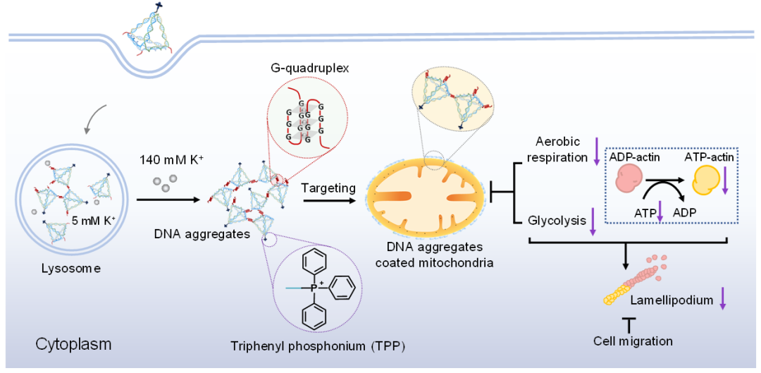 在该研究中,团队以线粒体作为靶标细胞器,设计合成了兼具钾离子响应性与线粒体靶向性的DNA四面体框架作为组装基元,实现了细胞内线粒体干预与细胞功能调控。根据应用功能需求,DNA四面体框架中,一个顶点经化学修饰上三苯基膦(TPP),可精准靶向线粒体;其余三个顶点设计富含鸟嘌呤GDNA序列,在细胞质内高浓度钾离子(~140 mM)的触发下,多G序列在DNA四面体框架之间形成稳定的G-四链体结构,使DNA四面体框架在线粒体界面完成组装聚集。由于DNA是带有大量负电的聚阴离子,线粒体表面的DNA聚集体严重影响了线粒体的表面电势,使线粒体膜电位下降。同时,DNA四面体在线粒体表面组装后影响了线粒体的动态分裂,细胞内线粒体数量下降,线粒体长径比减小,形态变得肿胀。而且,DNA四面体在线粒体表面组装后,显著抑制了细胞内有氧呼吸与糖酵解等能量合成过程,细胞内ATP水平显著下降。由于细胞内能量供应不足,细胞伪足结构合成受阻。伪足是细胞迁移活性的重要结构基础,因此,伪足含量降低显著抑制了细胞的迁移能力。相对于正常细胞,癌细胞迁移能力下降更为显著,迁移抑制率达50%,表明线粒体干预有望成为抑制癌症转移的新靶点。这一研究工作充分展示了DNA分子在细胞复杂环境内精准组装的独特优势,以及细胞内信号分子调控的外源分子动态组装在细胞器干预与细胞行为调控领域的应用潜力,为发展新型疾病治疗策略探寻了新途径。