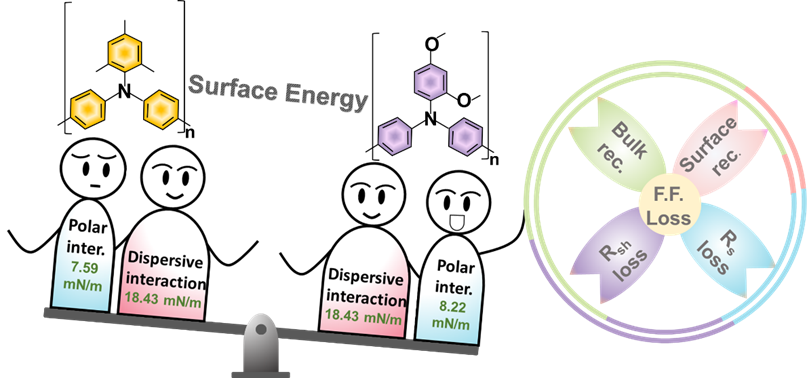 近日,福建物构所先进功能材料实验室高鹏研究团队设计了一种新型的空穴传输材料——聚[双(4-苯基)(2,4-二甲氧基苯基)胺] (2MeO-PTAA)。宛宛类卿,可2MeO-PTAA是有些高表面能在身上的。这是因为两个非对称取代给电子的极性甲氧基基团增强了2MeO-PTAA的色散分量,增加了表面极性,从而提高了其表面能。这种较高的表面能可以增加异相成核过程中钙钛矿晶核与聚合物空穴传输层之间的粘附力,2MeO-PTAA/钙钛矿界面接触更加紧密 (SEM截面图),不仅促进了空穴的抽取 (TRPL, EIS, TPC),而且降低了载流子复合损失(TAS, TPV)。基于2MeO-PTAA的钙钛矿电池器件效率为20.23%,填充高达84.31%。其较低的理想因子意味着Shockley–Read–Hall陷阱复合也得到了抑制。
