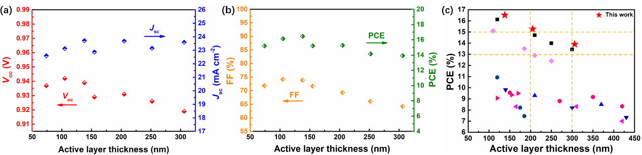 Figure 3. a) Plots of the Voc and Jsc versus the photoactive layer thickness ranging from ~ 74 to ~ 306 nm. b) Plots of the FF and PCE versus the photoactive layer thickness ranging from ~ 74 to ~ 306 nm. c) Plots of the PCE versus photoactive layer thickness for the efficient all-PSCs reported in the literature and this work.