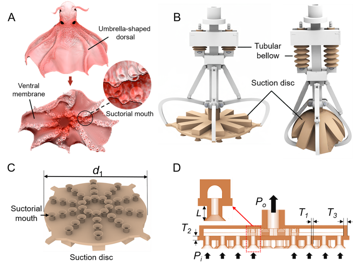 图1. (A) 发光吸盘章鱼的形态结构。吸嘴阵列分布在软臂上,背膜连接软臂形成伞状。(B) 仿生抓取手CAD模型。吸盘可以在管状波纹管的驱动下打开和关闭。(C) 吸盘CAD模型。具有漏斗形末端的吸嘴阵列分布在吸盘上。(D)吸盘内部通道示意图。