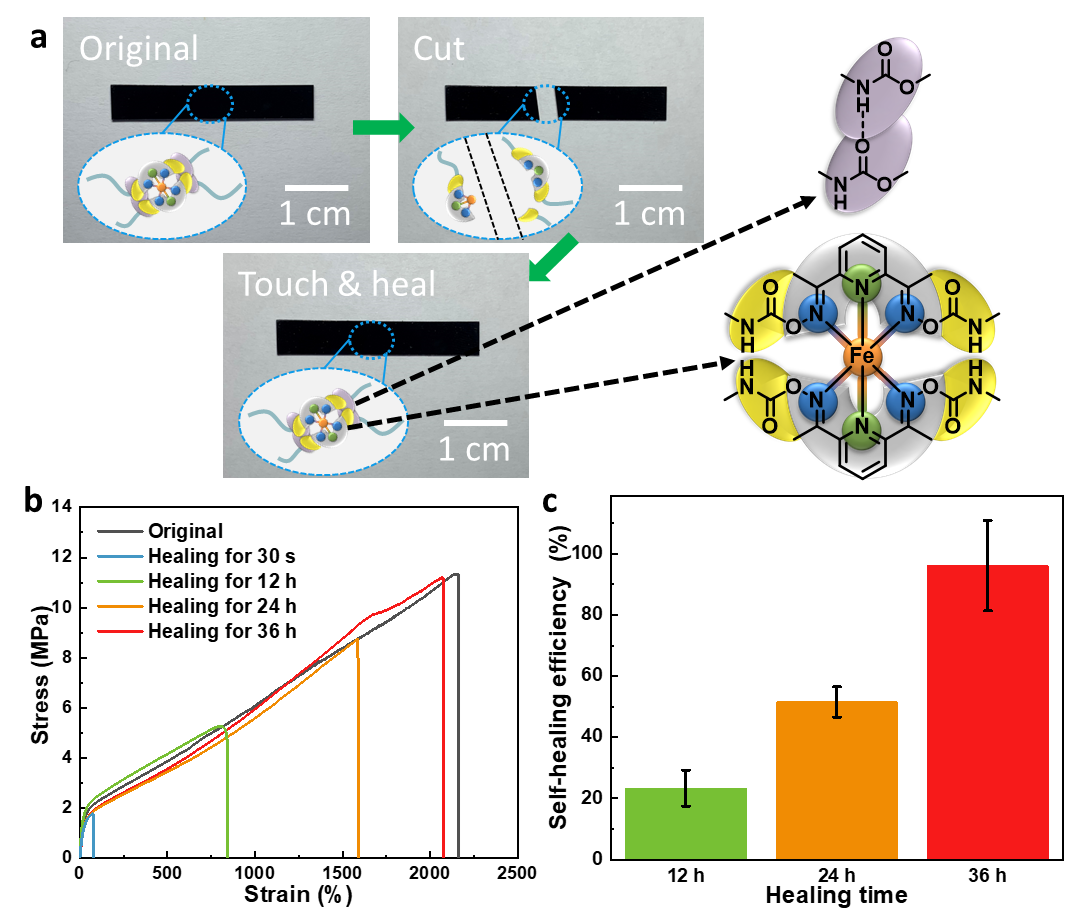 图3 (a)Fe-PPOU自愈合照片及示意图。(b-c)Fe-PPOU的自愈合后的拉伸曲线和愈合率。
