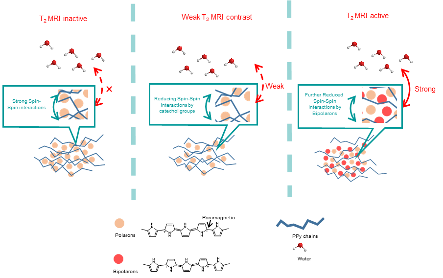 共轭聚合物被氧化时会分别产生具有顺磁性的单极化子(带一个正电荷)和双极化子。通常在共轭聚合物内部单极化子的孤对电子之间存在着强“自旋-自旋”相互作用,导致单极化子与水分子相互作用较弱,无法用于磁共振成像。基于此,研究团队提出了一种“部分配位”的方法,利用邻二酚类物质,将共轭聚合物中的未成对电子“释放”出来,转而与水分子相互作用;同时,在“部分配位法”的制备过程中,单极化子能够进一步偶联形成双极化子,而双极化子的静电排斥作用亦能增强单极化子与水分子的相互作用,由此成功制备得到了具有T2磁共振造影功能的聚吡咯纳米粒子,其作为造影剂用于体内磁共振成像的可行性已得到初步验证。这一“部分配位法”同样适用于其它聚合方法相近的共轭聚合物纳米材料如聚噻吩、聚苯胺类物质等。