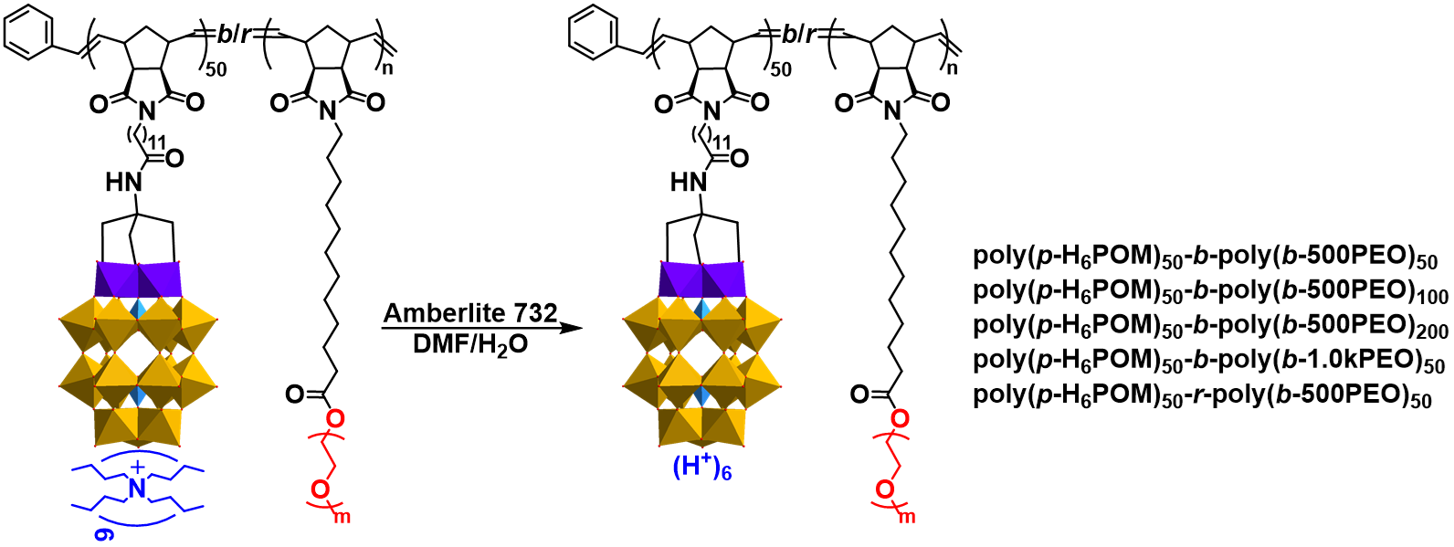 2014年,王维课题组首次报道了通过开环易位聚合(ROMP)反应合成以POM为侧基的杂化聚合物——聚多酸(poly(POM)),包括线性均聚物(ACS Macro Lett. 2014, 3, 211?215)和嵌段共聚物(Polym. Chem. 2015, 6, 7418–7426),并评价了它们的力学性能和催化活性(高分子学报,2017, 1159?1168)。接下来,该课题组详细研究了poly(POM)的溶液自组装结构(Chem. Eur. J. 2019, 25, 13396–13401),以及在本体稀溶液中的聚合物链构象(Chin. J. Polym. Sci. 2021, 39, 716?724)。最近,他们又将poly(POM)聚电解质复合物的外围抗衡离子置换成质子和碱金属离子,分别得到了POM的酸性聚电解质和盐类聚电解质均聚物(Macromolecules 2021, 54, 6891?6900)。2020年,王维教授与吴洪课题组首次合作测试了嵌段共聚物复合膜在燃料电池中的传导率(Int. J. Hydrogen Energy 2020, 45, 15495?15506)。