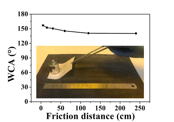 超疏水涂层的耐久性对于许多应用来说尤为重要,并且面临着重大挑战。常见的超疏水涂层通常很脆弱,此外受损的疏水涂层通常难以修复。该团队通过砂纸摩擦对ODA-PTA@CNC超疏水涂层的耐用性进行了检验。首先喷涂有ODA-PTA@CNC超疏水涂层滤纸在0.5 N压力下在砂纸上摩擦,开始时ODA-PTA@CNC超疏水涂层滤纸的水接触角随着摩擦距离的增加而略有下降,但下降的程度较小。随着摩擦距离的增加,水接触角下降程度愈发不明显,并且当摩擦距离大于100 cm时,水接触角保持稳定且大于140°(图7),表明ODA-PTA@CNC超疏水涂层具有优异的耐磨性,并且在纸基材料上有较好的附着能力,在纸质包装领域能有较好的应用前景。