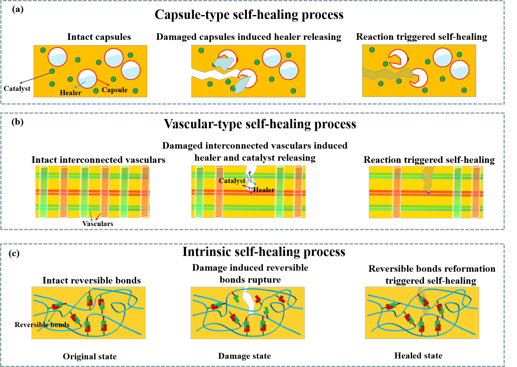 图2 自修复基本原理:(a) 胶囊型自修复过程; (b) 血管型自修复过程; (c) 本征型自修复过程(图片来源:Elctrochim. Acta)