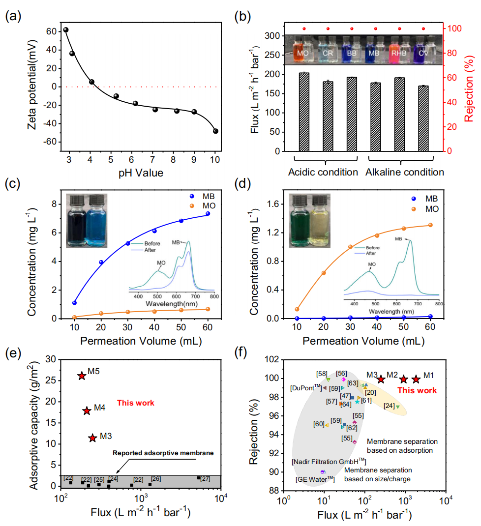 分子分离在日常生活、工业生产以及环境治理等过程中,例如水质净化、油气精炼、能源生产和储存、药物成分提取和纯化等有着广泛的应用。膜技术具有绿色可持续性、可规模化和分离过程高效等优势,日益成为分离纯化的研究热点。然而,膜材料存在渗透性和选择性之间的trade-off关系,制约了膜技术在分子分离应用领域的进一步发展。膜吸附是一种压力驱动的动态吸附过程,结合了吸附分离和膜分离的各自优势。与传统压力驱动分离膜相比,吸附分离膜利用膜内功能基团与溶质之间的相互作用,如静电相互作用、π-π相互作用、范德华力和氢键等,实现目标分子的高选择性吸附和快速分离。特别是对小分子有机物的分离而言,吸附分离膜有望兼具纳滤膜级别的高选择性与多孔膜的高渗透性,从而突破渗透-选择性的trade-off关系的制约。但由于传统吸附分离膜比表面积小、所包含的吸附位点有限,整体吸附容量较低,只能处理浓度非常低的料液;而且单次料液处理量较低,需要频繁的膜清洗与脱附再生,极大地影响了膜吸附技术的发展和实际应用范围的拓宽。