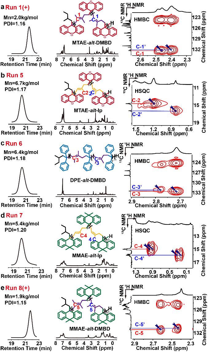 为了探究链结构对此类结晶聚烯烃的影响,设计了如下几组对比实验并通过多种核磁谱图对其链结构进行了详细分析(见图3)。