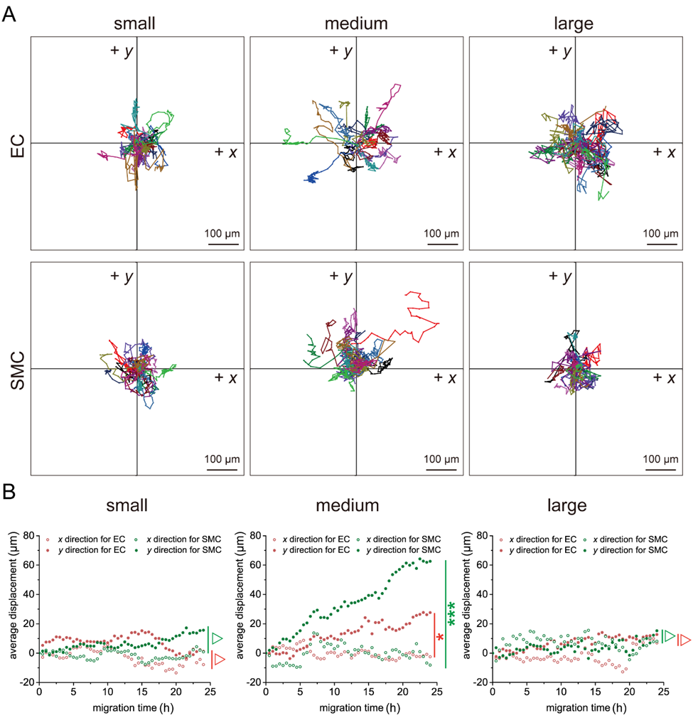作者统计了两类细胞在梯度纳米区域中迁移时在各个时刻x、 y 方向上的平均位移。对于内皮细胞和平滑肌细胞,在中等RGD 纳米间距起始范围的梯度纳米图案对两类细胞的定向迁移产生了选择性。