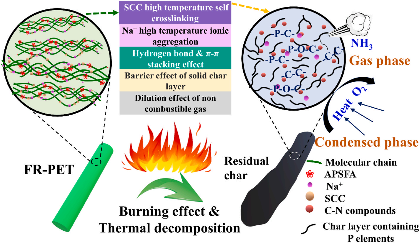 聚对苯二甲酸乙二醇酯(PET)纤维作为应用最广泛的聚酯纤维,具有强度高、耐磨、耐酸碱等优点,广泛应用于服装、建筑、交通、工业等领域。然而,PET作为一种热塑性可燃聚合物,其极限氧指数(LOI)仅为20-22%。当PET产品接触火源时极易燃烧,且伴有严重熔滴现象,易诱发次生火灾,危害人们的生命财产安全。因此,开发阻燃抗熔滴PET产品具有重要意义。PET的传统阻燃抗熔滴改性方法主要包括共聚、共混和后整理等。近年来,研究人员提出了新的PET阻燃和抗熔滴机理,如高温自交联、高温重排、离子聚集、氢键&π-π堆积效应等。