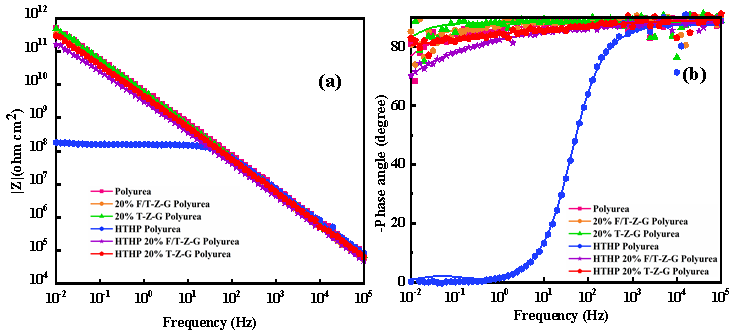 图1. 分别为纯聚脲涂层、20% T-Z-G聚脲涂层、20% F/T-Z-G聚脲涂层、HTHP聚脲涂层、HTHP 20% T-Z-G聚脲涂层和HTHP 20% F/T-Z-G聚脲涂层在2.8 MPaCO2和3.5wt.% NaCl溶液环境中浸泡24小时前(a)后(b)的EIS结果