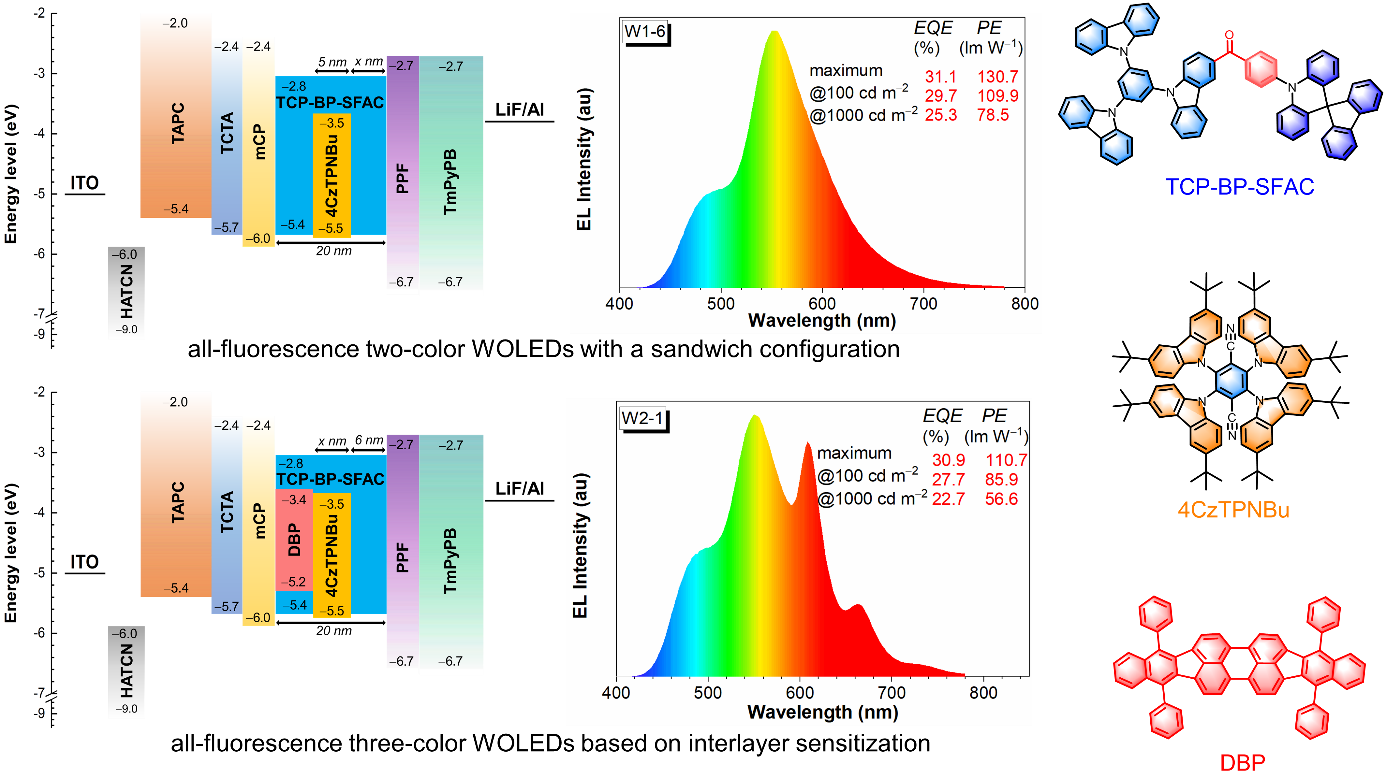 图1. 双色和三色全荧光WOLED的器件结构、最大效率、发射光谱及所用的发光材料。