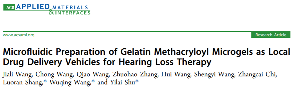 针对上述问题,复旦大学附属眼耳鼻喉科医院舒易来与王武庆以及复旦大学生物医学研究院商珞然课题组近期在ACS Applied Materials & Interfaces(1区,影响因子:10.4)杂志上发表了题为“Microfluidic preparation of gelatin methacryloyl microgels as local drug delivery vehicles for hearing loss therapy”的研究论文,研发了一种基于液滴微流控技术制作原位包裹地塞米松磷酸钠的新型Dexsp@GelMA缓释药物微载体,其通过鼓室注射后,显著改善了噪声性耳聋豚鼠的听力(图1)。