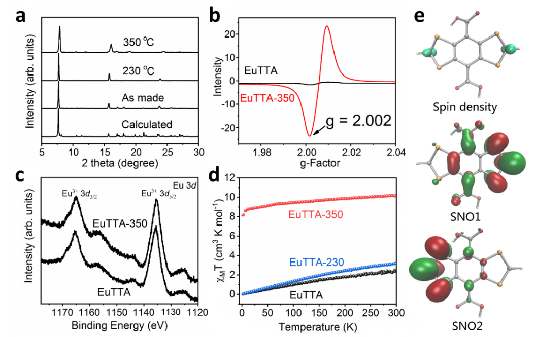 广东工业大学何军教授研究团队长期专注于含硫导电MOF、COF材料的设计合成(最新成果请见Coordination Chemistry Review, 2022, 450, 214235; Advanced Functional Materials, 2022, 2112072;ACS Appl. Mater. Interfaces 2022, 14, 1070; Chinese Chemical Letters, 2022, 33, 3227;ACS Applied Materials & Interfaces,, 2022, 28, 31942;Materials Research Letters, 2022, 10, 496)。在前期工作的基础上,最近何军教授、钟礼匡博士联合新加坡科技研究局(A*STAR)徐政涛教授等人报道了一种基于Eu-MOF框架,可以生成一种高达350°C也能稳定的有机自由基体系。此项研究工作还得到了余林教授的大力支持。