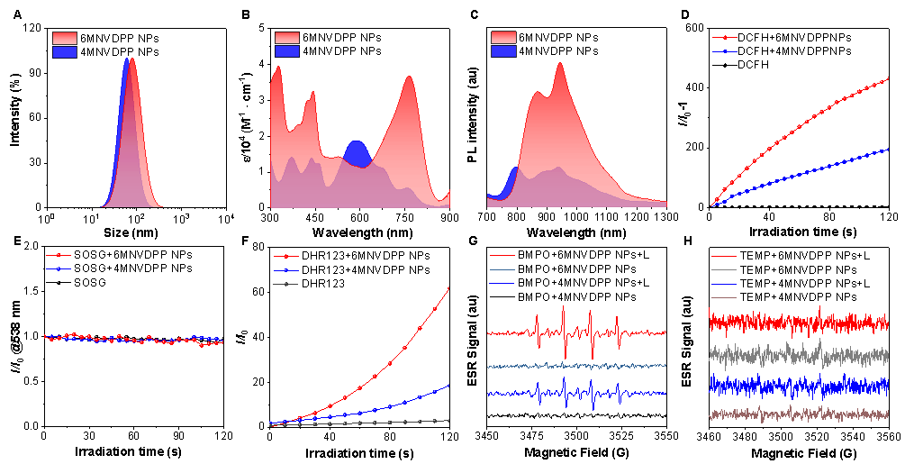 理论计算和单晶结构表明(图4和图5),由于6MNVDPP具有较大的表面静电势差,在6MNVDPP的晶体中,同层相邻分子通过萘环氢原子和DPP羰基之间的氢键形成双重分子间D-A相互作用;层间相邻分子通过强π-π相互作用同样形成双重分子间D-A相互作用。在三维D-A相互作用的驱动下,6MNVDPP形成了紧密的三维空间D-A互锁网络堆积。而在4MNVDDP的晶体中,无论层内还是层间均只存在单重D-D相互作用,分子堆积形成了二维D-D型J聚集。因此,6MNVDPP NPs表现出了更长的吸收波长、更大的摩尔消光系数以及更强的光热转换效率。鉴于6MNVDPP NPs优异的光物理性能,作者将6MNVDPP NPs经尾静脉注射到荷瘤小鼠体内,利用实体瘤的高通透性和滞留效应(EPR效应),对肿瘤组织实现了NIR-II荧光成像引导的光动力/光热协同治疗(图6)。