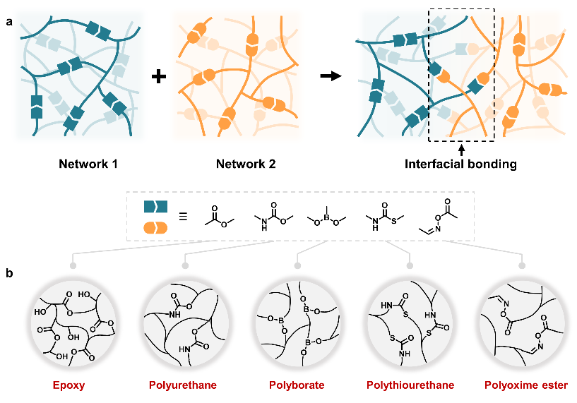 1 融合不同聚合物界面的策略。a)通过杂化交换反应连接不同聚合物的示意图。b)具有动态共价键的不同种类聚合物。