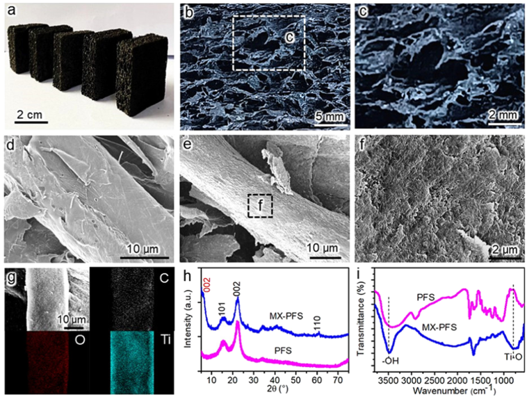 图3. (a) MX-PFS的宏观图; (b-c) MX-PFS截面的显微图; (d) PFS的SEM图; (e-f) MX-PFS的SEM图; (g) MX-PFS的元素扫描图; (h-i) PFS和MX-PFS的XRD和FT-IR谱图。