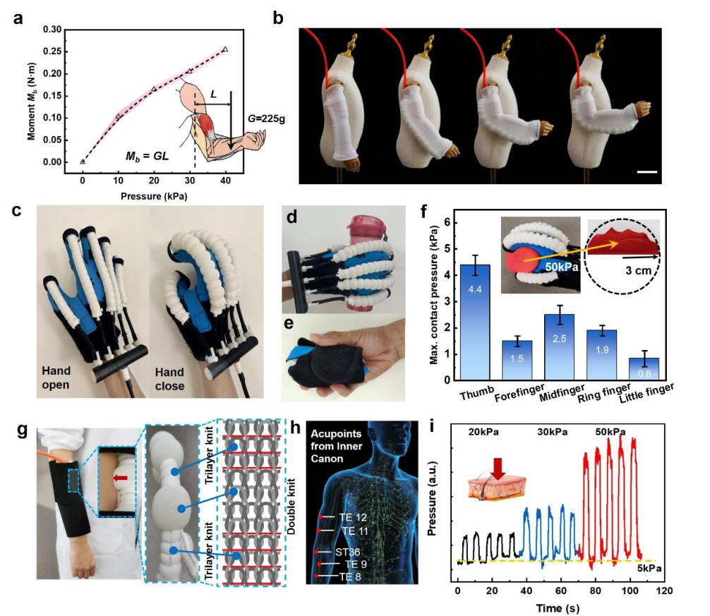 所设计的夹心衬垫针织基驱动器具有柔软、亲肤、舒适的特性,可作为辅助人体肢体运动或手指运动的人工肌肉动力源,通过反复施压和释压,使驱动器膨胀弯曲和回复,从而驱动关节完成运动。此外,还可以通过不同纺织结构的组合设计,实现施压过程中驱动器的不同膨胀变形,可以针对人体穴位进行按摩和理疗。