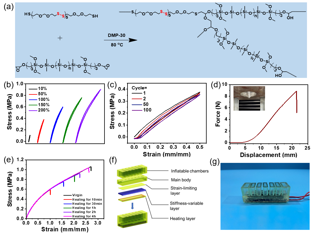 气动机器人手臂由于其广泛的应用而受到越来越多的关注。然而,其固有的低刚度使得它们不能胜任需要高负载能力或高力输出的任务。另一方面,当施加过大的压力或遇到尖锐物体时容易受到损坏。为此,南京大学化学化工学院李承辉教授课题组设计并合成了一种具有高机械刚度(杨氏模量为1.9 GPa,断裂伸长率<2%)以及优异的变刚度特性(当ΔT=90°C时,软-硬态切换能力σ高达3268000倍)的配位自适应网络(PETMP-AIM-Cu)(图1)。同时他们还将PETMP-AIM-Cu与基于动态二硫键的自修复弹性体(LP-PDMS)相结合,设计了一种新的气动机械臂。该机械臂在室温下具有高负载能力,同时在加热时也能轻易变形,可以灵活得进行气动驱动。得益于PETMP-AIM-Cu和LP-PDMS优异的自修复能力,整个气动机器人手臂在破坏并修复后仍然可以正常驱动。优异的可变刚度和可修复性能使得这种气动机械臂在应对复杂环境时的应用也是非常有利的。该工作以“A Variable-Stiffness and Healable Pneumatic Actuator”为题发表在《Mater. Horiz.》上。该研究得到国家自然科学基金委的支持。