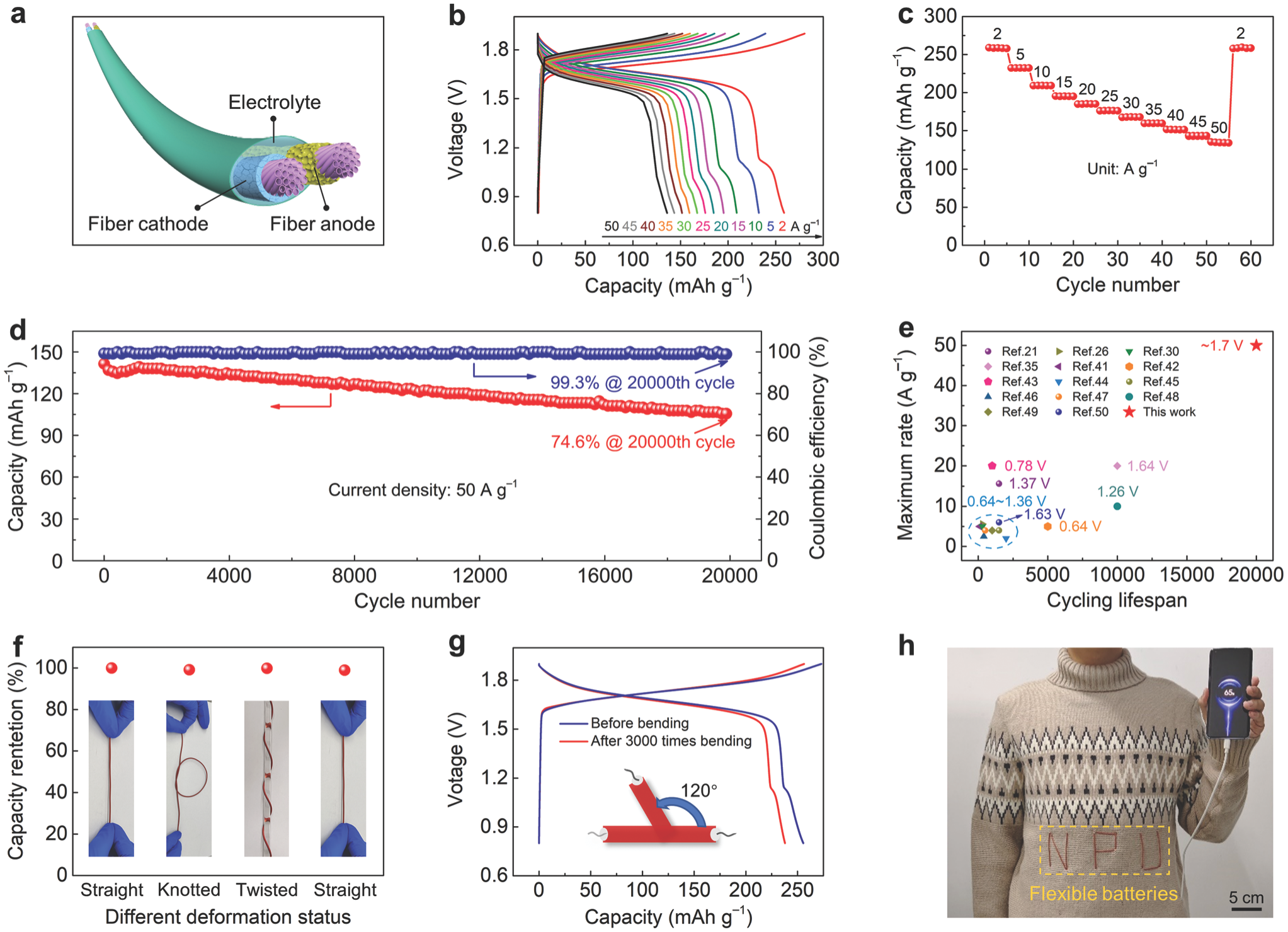 图5. 柔性水系锌电池的电化学性能和柔性研究
