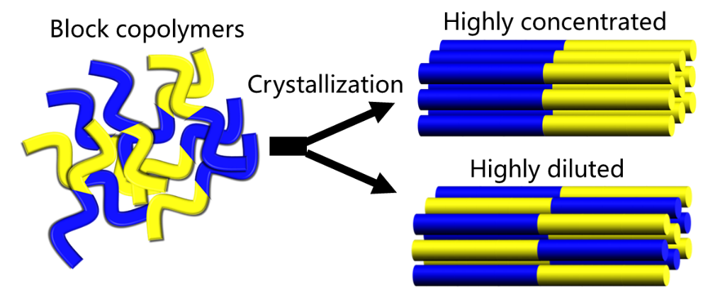图1 在由可结晶嵌段(黄色嵌段)和不可结晶嵌段(蓝色嵌段)组成的两嵌段共聚物中,不同分子链的可结晶嵌段平行排列在一端表示浓相,可结晶嵌段交错排列在两端表示稀相。