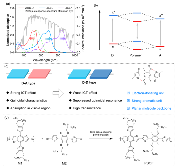半透明有机太阳能电池(ST-OSCs)由于具有能够建造出具有舒适外观的彩色半透明窗户、实现建筑一体化的前景,被认为是生产清洁能源的有效解决方案。原则上,为了实现高的光利用率的目的,半透明有机太阳电池需要尽可能地吸收近紫外(NUV)和近红外(NIR)区域的光子,同时允许可见光的透过。一种理想的活性层选择是将NUV的聚合物给体和NIR的小分子受体结合,在保证高效的光吸收的同时,实现高的透过率。高性能的超宽带隙聚合物能在满足吸收区间处于NUV区域的同时,还应该保证具有匹配的能级结构、良好的迁移率、能够形成合适的形貌。目前,针对超宽带隙聚合物给体的研究相对匮乏,缺乏明确的设计指导以及案例。针对超宽带隙聚合物给体进行不断地研究和探索有助于实现高性能的半透明有机太阳电池,推动半透明有机光伏的发展。