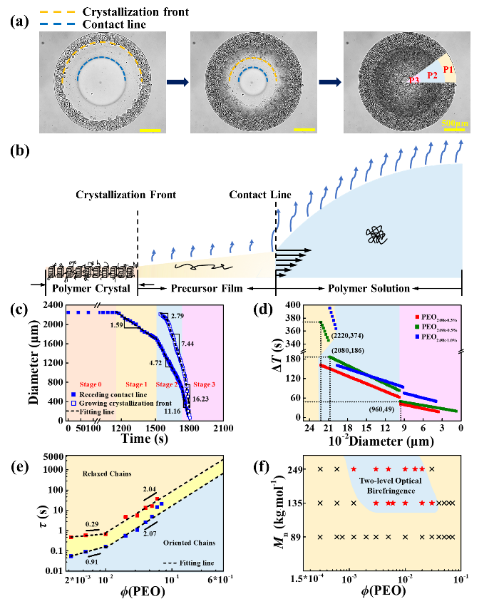 图4.(a)PEO249k-0.5%薄膜在整个挥发和结晶过程中的结构演变及(b)其示意图。(c)液滴直径和结晶生长前沿随时间变化关系。(d)接触线后退和结晶生长前沿之间的时间滞后关系。(e)PEO249k溶液的松弛时间随PEO溶液浓度变化关系。(f)二级光学双折射对分子量和初始液滴浓度的依赖性。