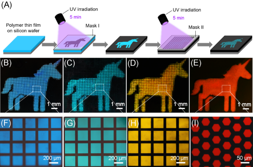 图4 主链型荧光聚电解质用于多色多尺度荧光光刻图案。