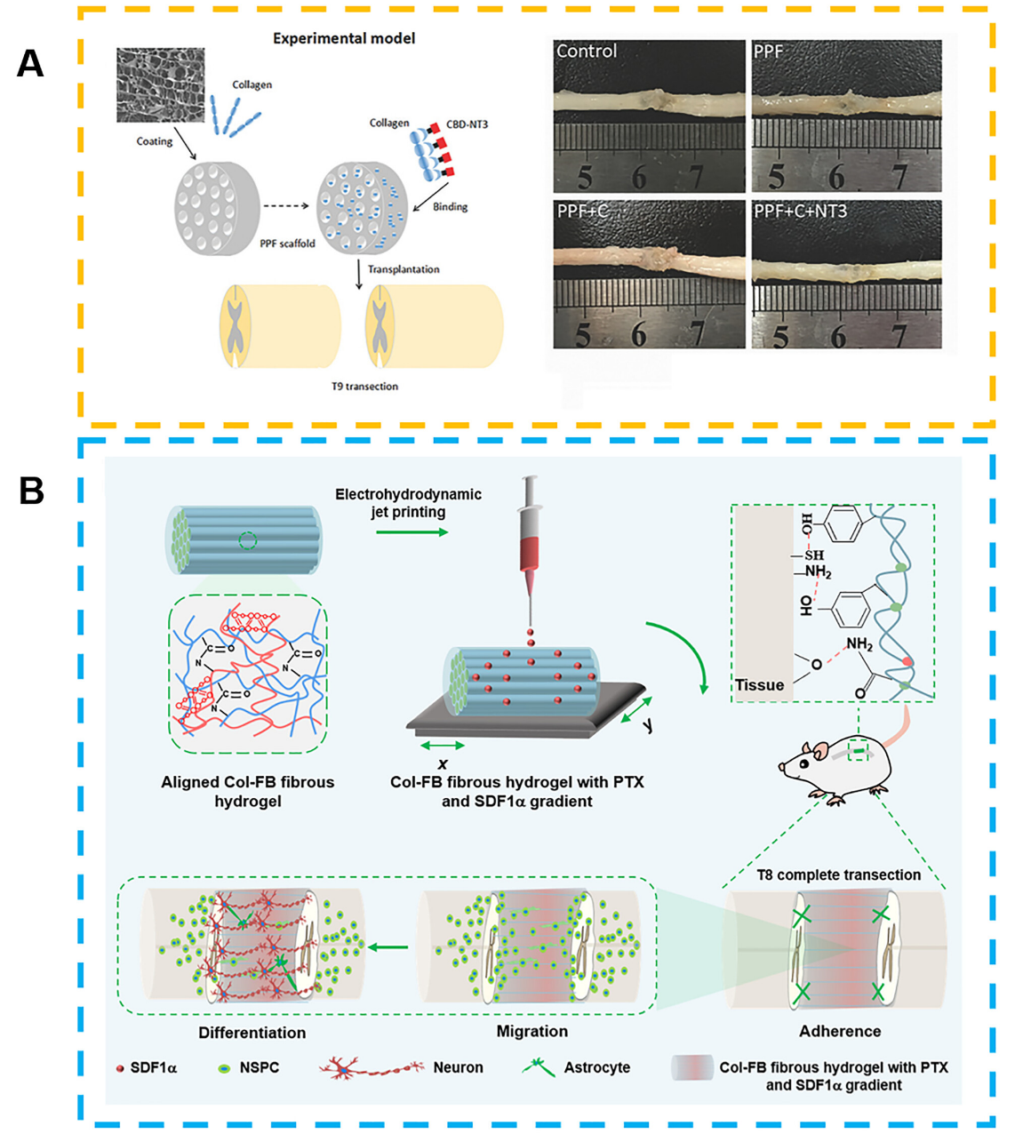 5 (APPF、胶原和CBD-NT3组合治疗实验模型BCol-FB水凝胶改善SCI大鼠神经连接的示意图。