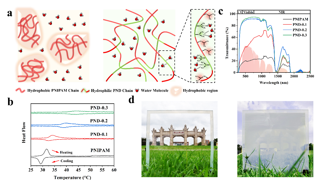 中山大学付俊教授团队和福州大学江献财副教授团队合作开发了一种能够满足不同气候条件需要的热致变色水凝胶智能窗户,通过连续调节水凝胶的相转变温度,实现了不同纬度地区、不同季节的室内温度调节。聚N-异丙基丙烯酰胺(PNIPAM)是著名的LCST(低临界共溶温度)型聚合物。当温度升至LCST(约32.5℃)以上时,PNIPAM水凝胶会由透明态转变为不透明态。利用这一特性,研究团队通过引入亲水性单体N, N二甲基丙烯酰胺(DMAA),与NIPAM共聚(图1a),在32.5 °C-43.5 °C范围内实现了对LCST的连续调控(图1b)。当温度低于其LCST时,P(NIPAM-DMAA)共聚物水凝胶透明度极高,全波段的光透过率大于91.30%(图1c),在LCST以上温度则不透明(图1d)。
