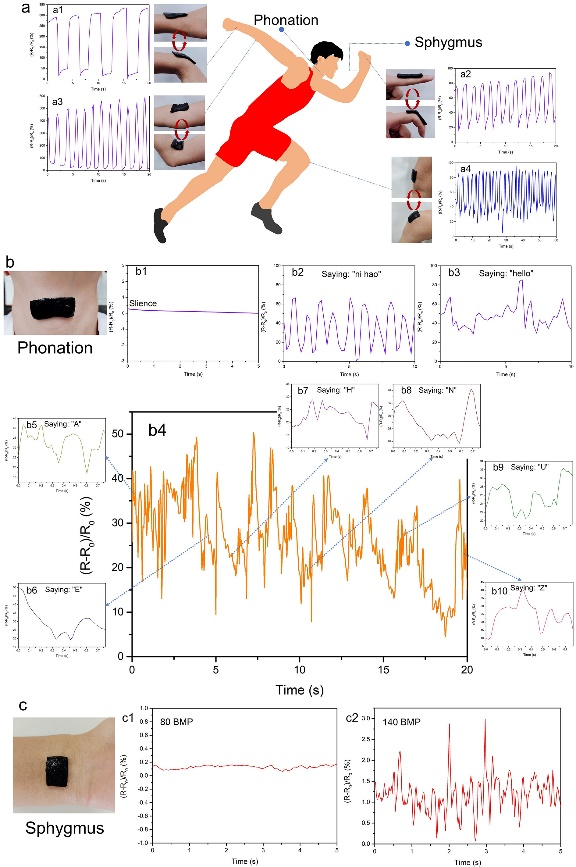 图6 (a) CMC/PDA@Fe3+水凝胶被组装成一个传感装置实时监测人体运动,手腕弯曲(a1),手指弯曲(a2),手肘弯曲(a3),跑步(a4)的相对电阻变化;(b) 水凝胶检测喉咙发声的相对电阻变化.沉默(b1),说“ni hao”(b2),说“hello”(b3),说26个英文字母(b4);(c) 水凝胶检测脉搏的相对电阻变化 (c1) 平静状态下,(c2) 运动状态下