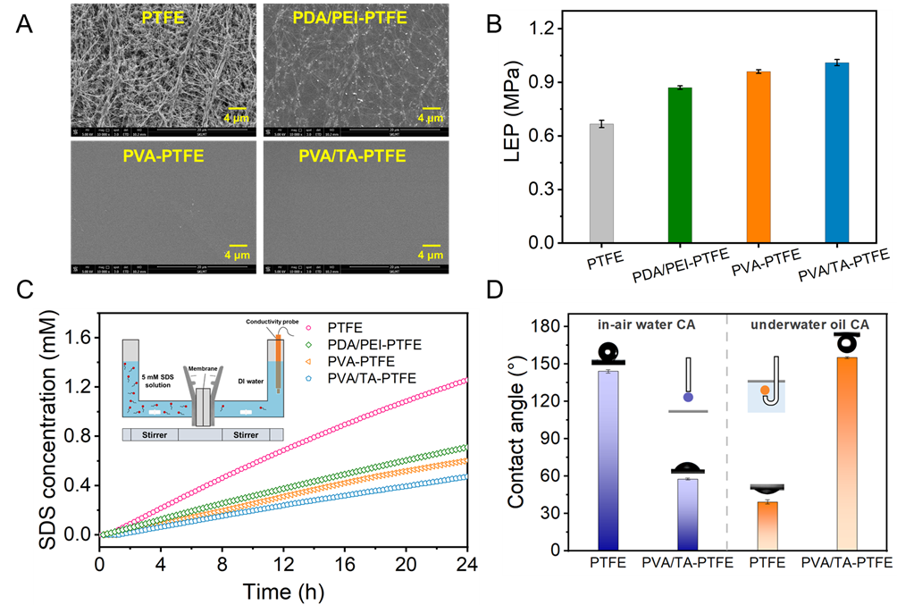 图3膜的形貌结构、液体进入压力、表面活性剂扩散和润湿特性
