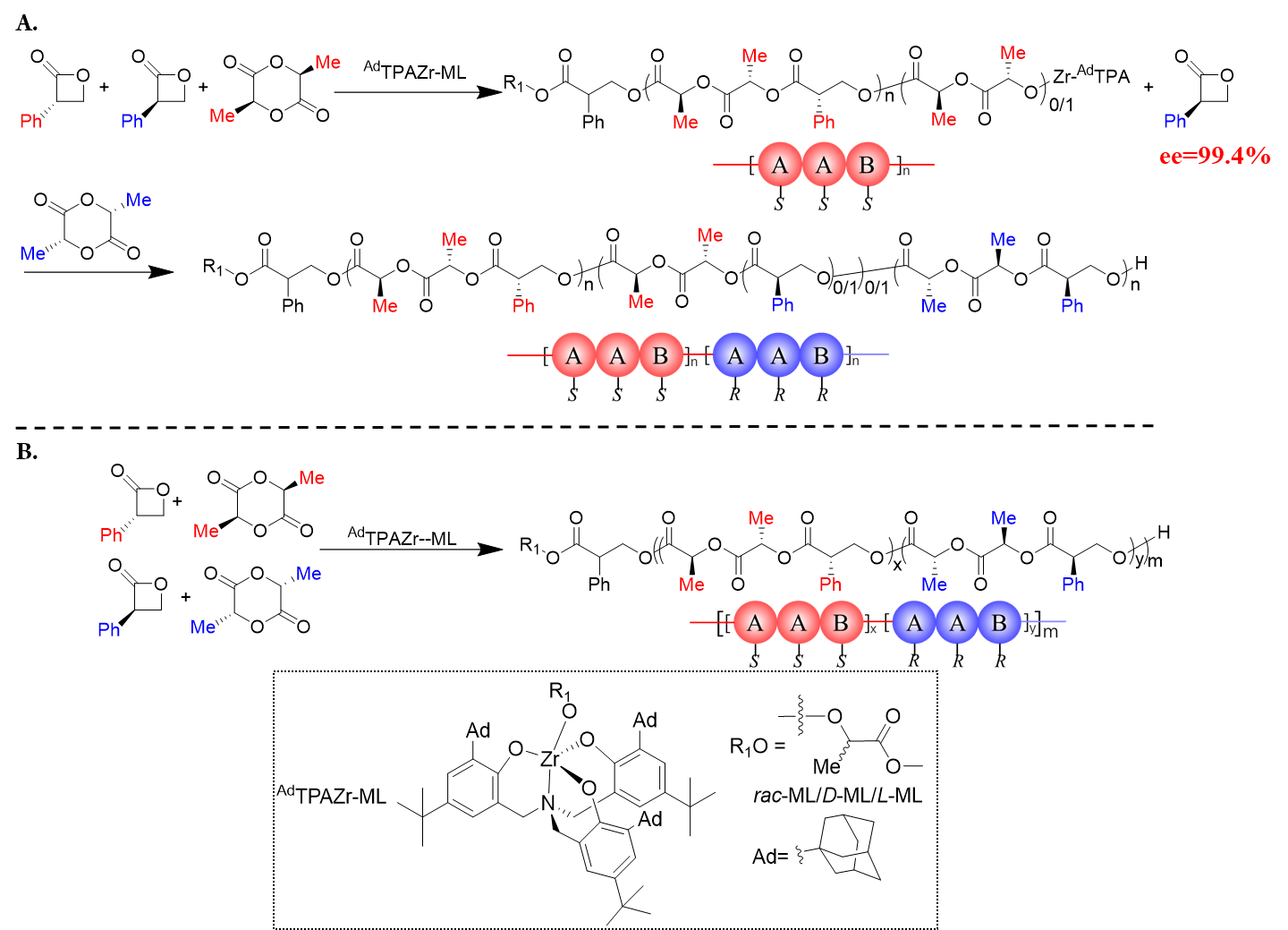 图1 不对称动力学拆分共聚合成AAB型交替共聚物和双嵌段共聚物。