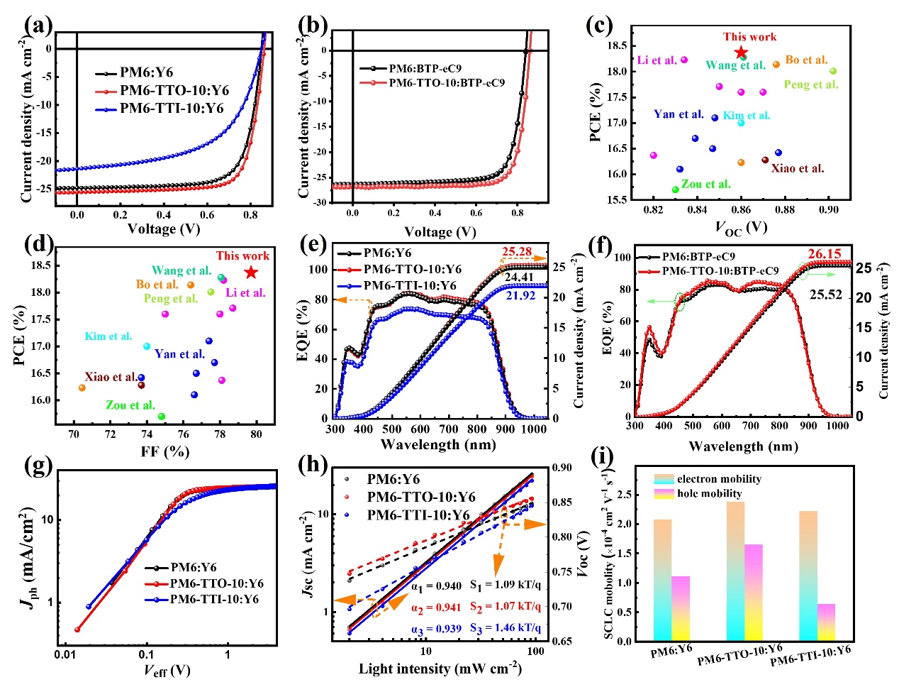 [结晶度和形貌]:研究者采用掠入射广角X射线散射(GIWAXS)、原子力显微镜(AFM)和透射电子显微镜(TEM)测量了聚合物的分子堆积和形貌特征。与PM6相比,PM6-TTO-10表现出相似的结晶度,表明通过无规共聚引入TTO单元只是轻微地改变了母体聚合物的结晶度和分子堆积,因此不会显著影响电荷传输和光电性能。然而,PM6-TTI-10的π-π堆积距离明显较大,晶体相关长度显著降低,表明TTI单元严重破坏了母体聚合物的结晶度和有序排列。AFM和TEM数据证实PM6-TTO-10:Y6共混膜表现出更明显的相分离,更清晰的纤维特征和互穿网络形貌,有利于激子的有效解离和电荷传输。相反,PM6-TTI-10:Y6共混膜显示出均匀的形态,没有明显的相分离,这可能是由于PM6-TTI-10和Y6之间的过度混溶导致。结合DFT结果和分析,可以推断出这三种活性层膜的内部微观结构,引入具有正ESP的TTO削弱了给体和受体之间的相互作用,促进了共混膜的适当相分离。相反,具有负ESP的TTI增强了D-A相互作用,并促进了给体和受体之间的过度混溶。值得注意的是,首次发现氯原子区域异构化可以有效改变分子ESP和给-受体的相互作用,从而调节共混膜的相分离形貌,优化器件性能。