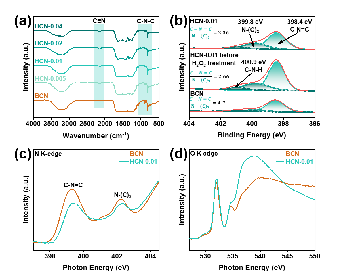 在g-C3N4分子骨架中引入氮空位和氧掺杂明显改变了样品的光学性质和可见光捕光能力。如图3a所示,HCN催化剂比BCN具有更强的可见光吸收能力,由于氮空位和氧掺杂剂的引入,HCN催化剂表现出显著的吸收红移。根据Kubelka-Munk函数的计算结果,BCN和HCN的带隙从2.53 eV逐渐窄到2.18 eV。瞬态荧光的结果也表明HCN(1.15 nS)的荧光寿命比BCN(0.67 nS)长(图3c),这表明光致电子/空穴的复合减少。通过电化学阻抗响应(EIS)和瞬态光电流响应研究了BCN和HCN的光电电化学性能。由于HCN的导电性较高,其Nyquist图中的半圆直径比BCN小得多,从而降低了光电子传递电阻。与BCN相比,在HCN-0.01中观察到快速且可重复的光电流响应(图3d),表明具有较强的电子转移能力和光生载流子分离能力。