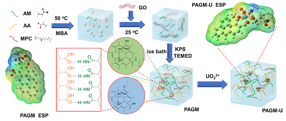 近日,郑州大学申长雨院士、刘春太教授团队的杨佩佩博士和李松伟博士课题组将采用氧化石墨烯(GO)和聚丙烯酰胺/聚丙烯酸(PAM/PAA)制备具有光热转化特性的水凝胶,用于从海水中高效提取铀。在PAM/PAA/GO水凝胶中引入两性离子2-甲基丙烯酰氧基乙基磷酸胆碱(MPC)得到PAM/PAA/GO/MPC(PAGM),具有良好的抗菌性能。PAGM展示了铀(VI)(U(VI))的有效和特异性吸附。光照条件下,PAGM的吸附容量达到196.12 mg g-1(pH = 8,t = 600 min, C0= 99.8 mg L-1, m/v = 0.5 g L-1)。吸附能力仅为160.29 mg g?1在黑暗条件下(pH = 8,t = 600 min,C0= 99.8 mg L-1, m/v = 0.5 g L-1)。光的吸附容量比暗光高22.5%。此外,PAGM在五次吸附-解吸循环后表现出良好的重复性和稳定性。在天然海水中储存一个月后PAGM的U(VI)吸附容量为6.1 mg g-1。X射线光电子能谱(XPS)结果表明, 氨基、羧基和羟基与U(VI)的配位是U(VI)吸附的主要机制,并通过详细的密度泛函理论计算证实了其机制。PAGM具有耐久性、高效率、光热转换性能和抗菌性能。