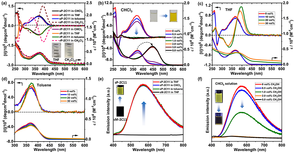 2(a) sP-2C11/rP-2C11在不同溶剂中的CD光谱;在CHCl3 (b)THF (c)与甲苯(d)中加入不同甲醇量的CD光谱;(e)不同溶剂中的荧光光谱;(f) CHCl3中不同甲醇加入量下的荧光光谱