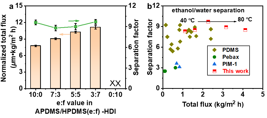 图5. APDMS/HPDMS(e:f)-HDI膜的(a)渗透汽化性能和(b)分离性能比较图