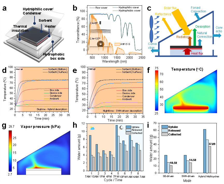 近日,上海交通大学王如竹教授领衔的“能源-水-空气” 交叉学科创新团队ITEWA(Innovative Team for Energy, Water & Air)与新加坡国立大学Tan Swee Ching教授合作在Advanced Materials期刊发表名为All-day Multicyclic Atmospheric Water Harvesting Enabled by Polyelectrolyte Hydrogel with Hybrid Desorption Mode的研究论文。论文开发了新一代聚电解质凝胶复合吸附剂实现快速的吸附特性,并结合余热及太阳能混合解吸策略实现快速水释放。为了尽可能快速的吸附-解吸循环特性,优化了系统内传热传质特征以及全天循环策略,实现了取水量的倍增以及全天候的空气取水,为下一代空气取水材料开发、系统优化提供新的见解。论文的作者为上海交通大学制冷与低温研究所、新加坡国立大学材料系联合培养博士生山訸,通讯作者为王如竹教授和Tan Swee Ching教授。