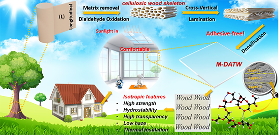 近期,南京林业大学陈楚楚课题组提出了一种在不引入任何透明高分子聚合物及胶黏剂的条件下,借助表面氧化及正交层压设计,通过纤维素纤维之间的自粘合效应,构建了一种近似各向同性的全木材基透明层合木。与普通玻璃相比,这种透明木材的导热性大大降低(0.27 W m-1 K-1),同时兼具高透光率(≈85.4%)与低雾度(≈20%),及近似各向同性的高力学强度(其中,湿强度达128 MPa)。