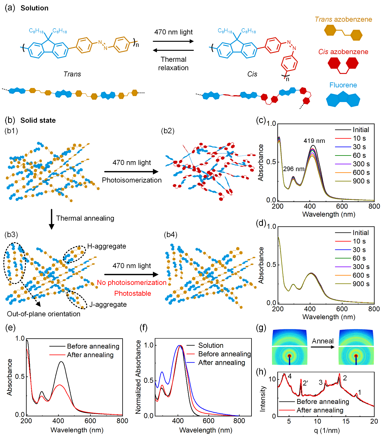MC-Azo在溶液中可以发生可逆的反式-顺式异构化(图2a)。在薄膜中,退火前的MC-Azo仍然具有光响应性,可以在470 nm光的照射下发生光致异构。而在200 °C退火12小时后,MC-Azo由于退火造成的链堆积而失去了光响应性,变成了光稳定的材料(图2b-h)。
