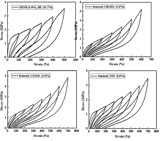 图3. 聚合物及离聚体的循环拉伸曲线。