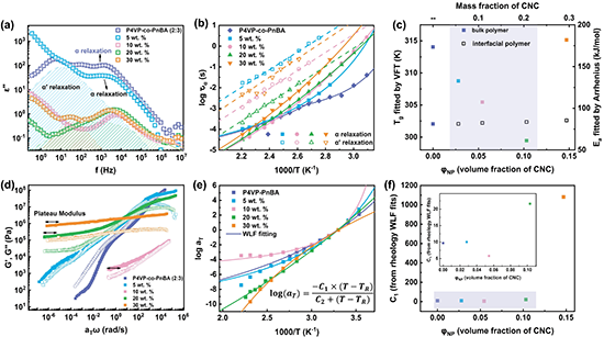 宽频介电(BDS)用于量化PNCs中聚合物的动力学来了解界面吸引力对聚合物链段动力学的影响。PNCs中存在两个松弛过程,特征松弛时间可以通过Havriliak?Negami(HN)方程拟合得到(图2a)。慢的松弛过程(α’松弛)是来自于界面层聚合物,而快的松弛过程(α松弛)则是来自于本体聚合物。在高CNC含量的PNCs中可以观察到介电谱图上峰值强度的减小,这表明聚合物界面层的受挫堆积,与密度测量结果和上述PNCs的SAXS研究一致。α和α’松弛时间的温度依赖性分别符合VFT和Arrhenius定律(图2b)。BDS测试的温度范围高于纯的聚合物的玻璃化转变温度(Tg),其α松弛反映了本体聚合物的活化协同链段松弛过程。VFT型温度依赖性类似于在纯的聚合物Tgs以上的运动。然而,对于界面层聚合物,聚合物链与CNC表面的强、多重结合显著抑制了聚合物的协同链段动力学,使其成为冻结状态。这类似于玻璃材料的动力学,例如聚合物在其Tg以下的链动力学。对α′松弛进行Arrhenius拟合得到了活化能(Eas)。拟合得到的活化能在不同CNC浓度的PNCs中几乎不变,这表明CNC对聚合物动力学的表面受限效应与CNC含量无关(图2c)。BDS拟合得到的界面层厚度与SAXS拟合得到的厚度趋势是一致的,同时随温度变化几乎没有变化。对于PNCs中本体聚合物的动力学,与纯聚合物相比,α松弛加速了约34%,并且在20 ?wt. %时松弛最快,在30? wt. %时松弛变慢。受挫堆积产生额外的自由体积,并在低CNC含量下加速链段运动。然而,随着CNC含量的增加,本体聚合物受到界面层聚合物的空间限制,并且显示出缓慢的链动力学。