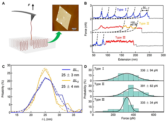 图1.聚乙烯单晶的SMFS实验。(A)PE单晶中力诱导熔融的示意图。插图为PE单晶的AFM高度图。(B)PE单晶在39℃时获得的典型的力-拉伸(F-E)曲线。(C)类型Ⅰ和类型Ⅱ曲线的峰间距ΔL1和ΔL2的统计图。(D)三种类型曲线的解折叠力值统计图。