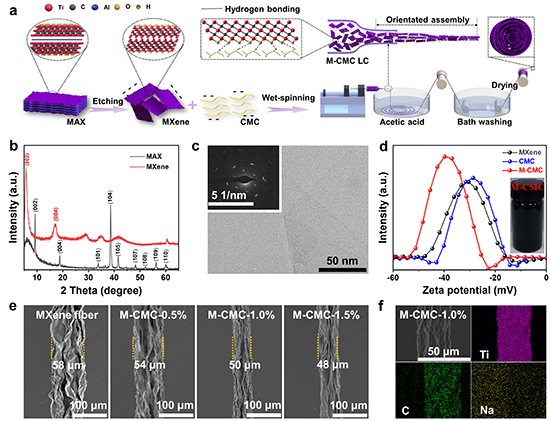 图2对湿法纺丝制备的MXene复合纤维进行了表征,证实了CMC在MXene复合纤维中发挥间隔剂和连接剂的作用。